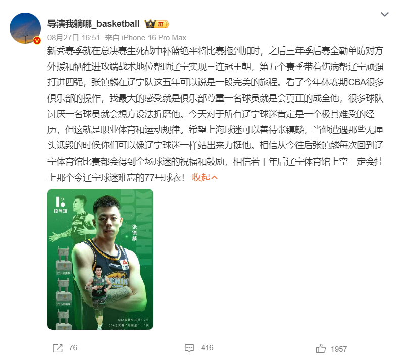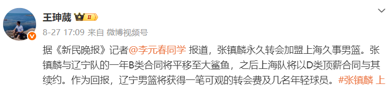 北京时间8月29日,辽宁男篮官方宣布,张镇麟正式永久转会至上海男篮,此次转会的达成,我们首先基于对张镇麟本人职业发展规划与个人意愿的充分尊重。在沟通的全过程中,俱乐部始终将球员的个人成长置于重要位置。我们理解并支持每一位球员对自身职业生涯的考量与选择,这是辽宁男篮一贯秉持的理念。
